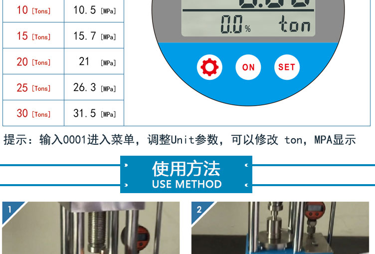 产品介绍 采用一体式结构,不掉压力,不漏油。适用于材料科学研究、催化实验 陶瓷烧结实验,水泥建材、药品研发制样等行业 仪器型号 YP-30S 压力范围 0-30T(0-32Mpa) 油缸直径 110mm 压力换算 1Mpa=0.95T 压力表 DDNT高精度数字传感,吨位显示(T)可切换 兆帕(Mpa),精度0.01T 活塞行程 40mm 压力稳定性 ≤1Mpa/10min 工作台直径 Φ120mm 立柱数量 4根 有效空间 92×92×160mm 外形尺寸 275×210×475mm 设备重量 57.5Kg 整体结构 手动液压制式,锻造工艺,一体式结构 (搭载68号耐磨液压油) 配置说明 根据客户需求加高立柱,可选配承压范围内各类圆形 方形,异形,电池模具等。