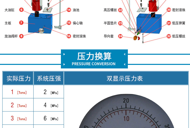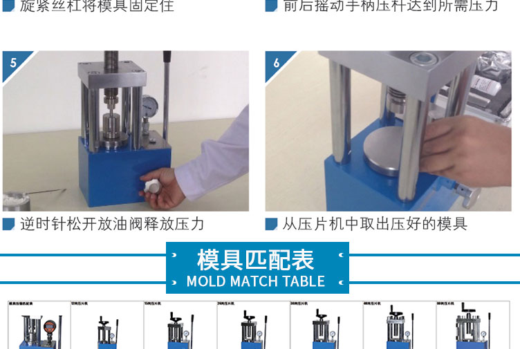 产品介绍 采用一体式结构,不掉压力,不漏油。适用于材料科学研究、催化实验 陶瓷烧结实验、水泥建材、药品研发制样等行业。 仪器型号 YP-15R 安全量程 0-15T(0-30Mpa) 压力表最 大量程 0-20T(0-40Mpa) 油缸直径 80mm 压力表 压力吨位(T)/压强兆帕(Mpa)双刻度显示 活塞行程 30mm 压力稳定性 ≤1Mpa/10min 工作台直径 Φ90mm 立柱数量 4根 有效空间 80×80×150mm 外形尺寸 250×180×425mm 设备重量 42.5Kg 整体结构 手动液压制式,锻造工艺,一体式结构(搭载68号耐磨液压油) 配置说明 根据客户需求加高立柱,可选配承压范围内各类圆形,方形,异形, 电池模具等