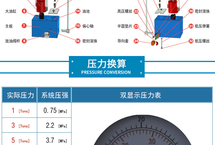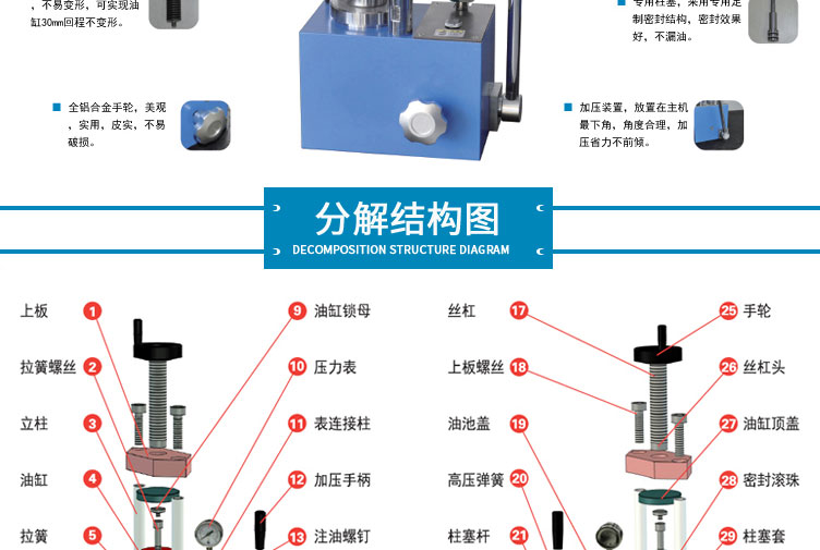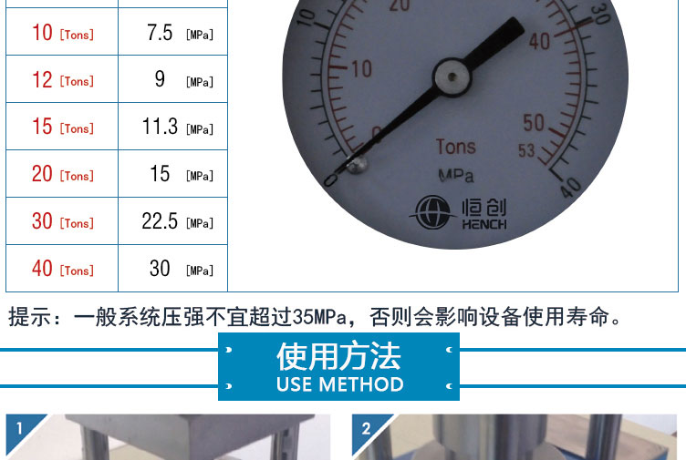 产品介绍 采用一体式结构,不掉压力、不漏油。适用于材料科学研究、催化实验 陶瓷烧结实验,水泥建材、药品研发制样等行业。 仪器型号 YP-40 安全量程 0-40T(0-31.5Mpa) 压力表最 大量程 0-53T(0-40Mpa) 油缸直径 130mm 压力换算 1Mpa=1.33T 压力表 压力吨位(T)/压强兆帕(Mpa)双刻度显示 活塞行程 50mm 压力稳定性 ≤1Mpa/10min 工作台直径 Φ140mm 立柱数量 4根 有效空间 106×106×160mm 外形尺寸 300×220×455mm 设备重量 79Kg 整体结构 手动液压制式,锻造工艺,一体式结构(搭载68号耐磨液压油) 配置说明 根据客户需求加高立柱,可选配承压范围内各类圆形,方形,异形, 电池模具等