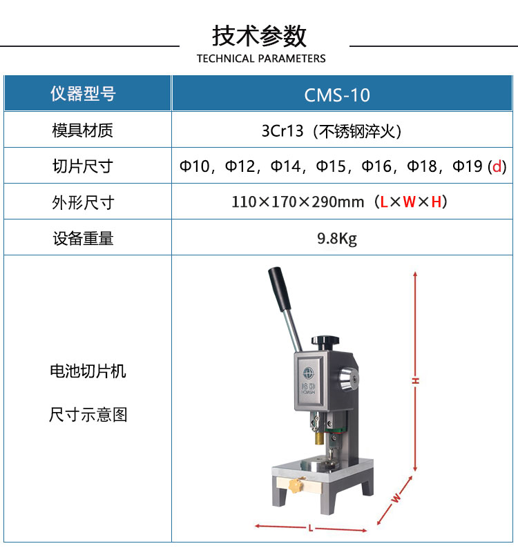 产品介绍 冲头材质:3铬13#模具钢(淬火) 切片尺寸:03~24mm(可定制) 接料盒:防静电ABS材质 适配:锂电正或负极片、隔膜片 冲头压力:200Kg 冲头行程:16mm 重量:6.5Kg