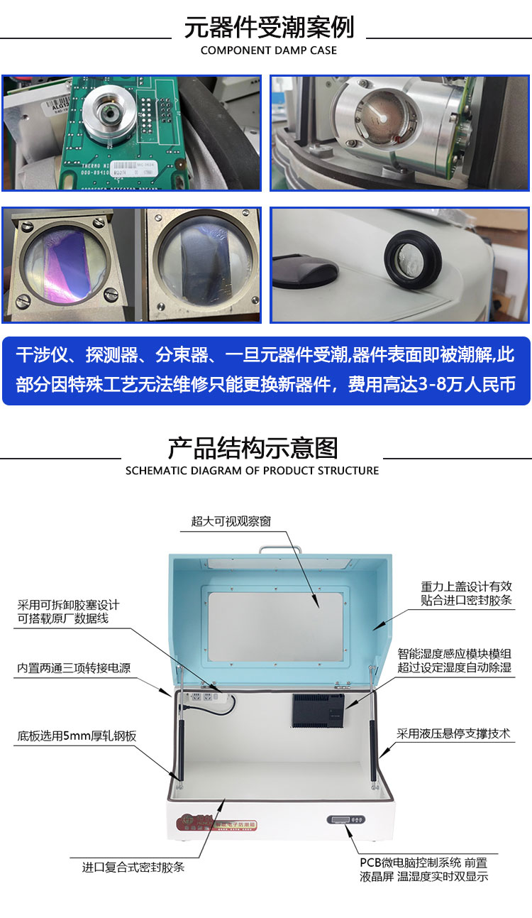 产品介绍 天津恒创立达科技发展公司生产的MRD系列电子防潮箱是傅里叶红外光谱仪专用的防潮电子产品。适用于国产、进口的中、小型傅里叶变换红外光谱仪。目前该产品已经走进多所高校和多家药企,解决了傅里叶红外光谱仪容易受潮的问题,得到了客户的一致好评! 产品特点: 1.HOX系列电子防潮箱设置为三档可调,取件范围:20%-50%。 2.内部有再生干燥剂,再生干燥剂吸湿一段时间会饱和,再生干燥剂的干燥箱内部阀门会关闭,同时,连接外面的阀门会打开,仪器会通过电加热的方式将水分加热为水蒸气挥发,除湿完成后,外部阀门关闭,内部阀门打开,此过程保持通电即可自动完成。 3.本产品尺寸齐全,可按需定制,适配国产/进口红外光谱仪