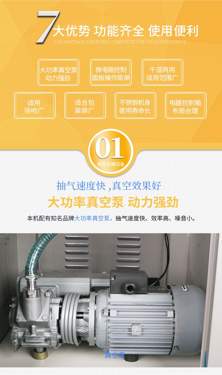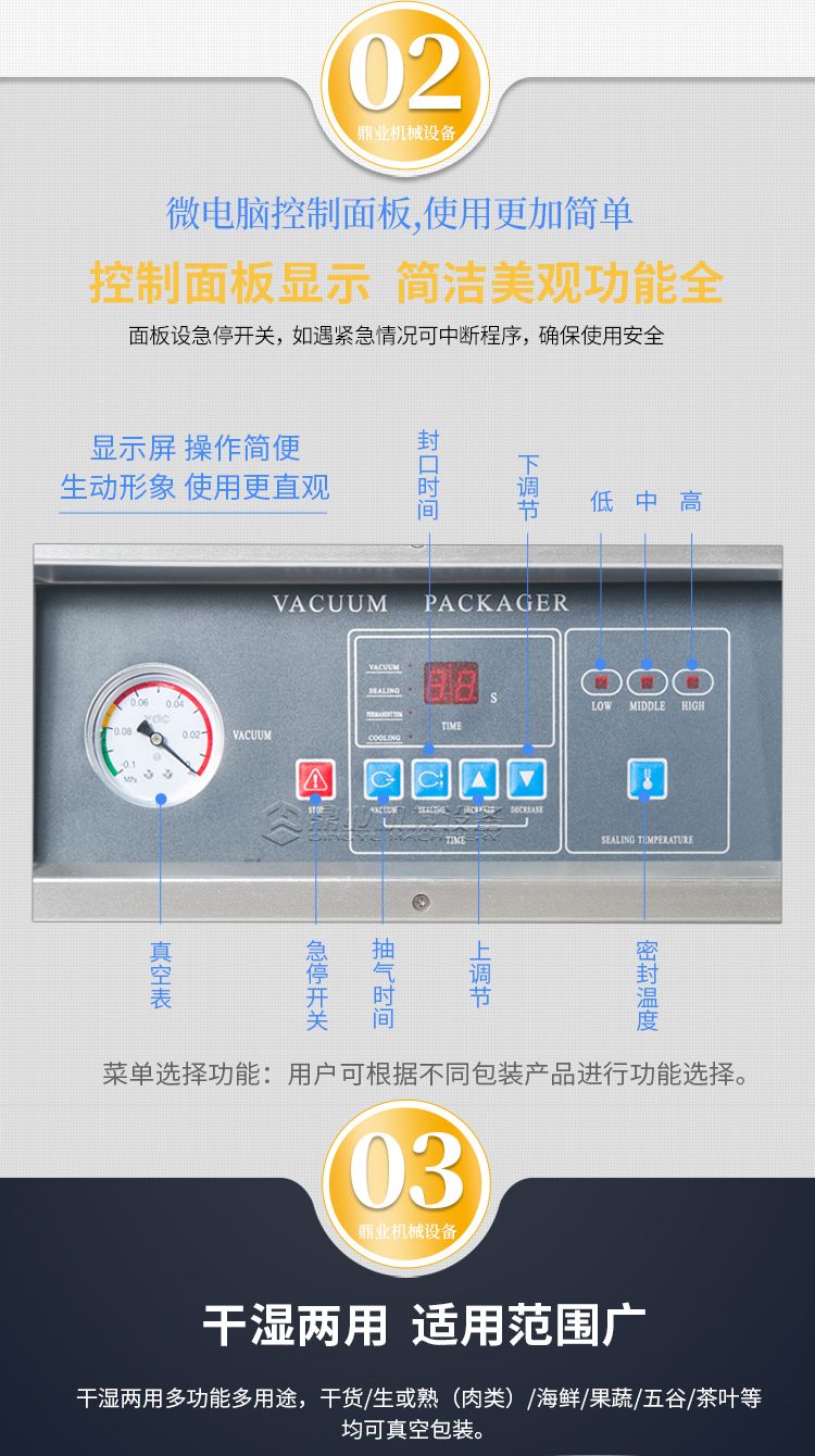 产品介绍 本系列真空包装机具有抽真空、封口、印字一次性完成的功能。适用于食品、药品、水产、化工原料、电子元件等产品的真空包装;可防止产品的氧化霉变、防腐防潮、可保质保鲜,延长产品的储存期限。