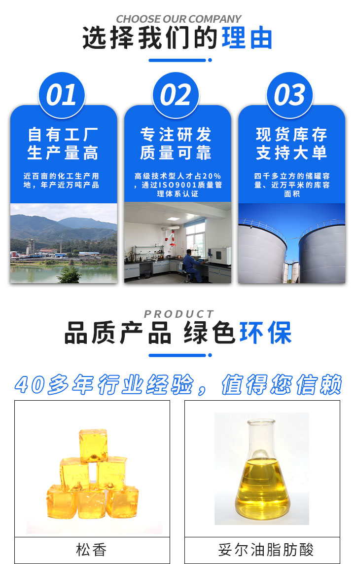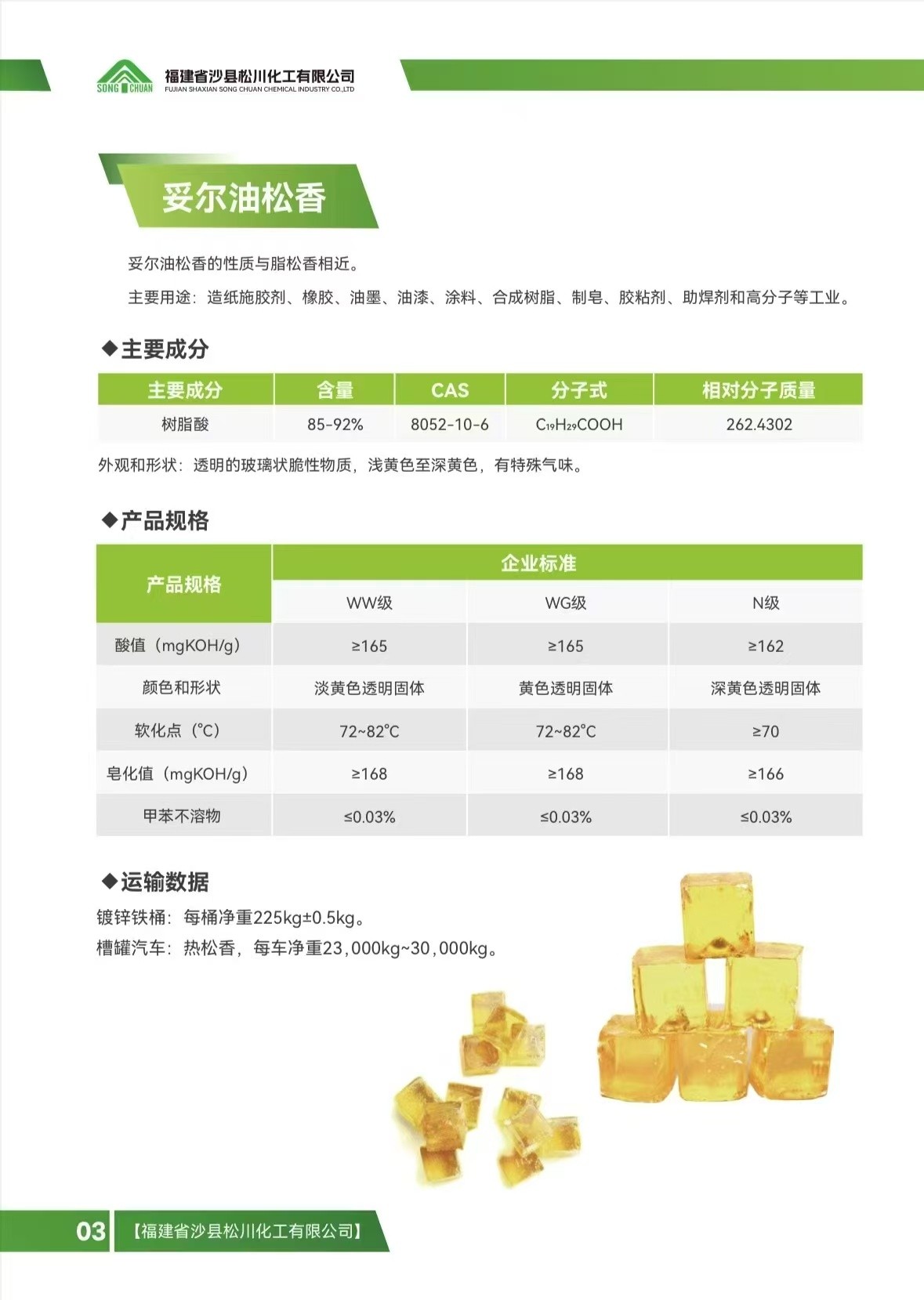 产品介绍 松香 妥尔油松香的性质和用途与脂松香相近,主要用于合成树脂、酚醛树脂、油漆涂料、黑色印刷油墨、助焊剂、胶粘剂、橡胶软化剂、胶粘剂和高分子等工业。 包装:镀锌铁桶包装,每桶净重225kg±0.5kg。