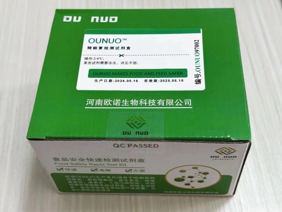 产品介绍 辣椒辣度检测试剂盒(Ounuo97002) 本品采用竞争性酶免检测技术用于辣椒及其制品辣度的定量分析,最大可满足96次测试,在做复孔的情况下,一次最多可检测42个样本。 产品特性: 1. 快速(<10min)、高回收(≥80%)和高效的前处理方法 2. 检测限1度辣度,定量限2度辣度 3. 快速,检测时间30min 4. 高的重现性