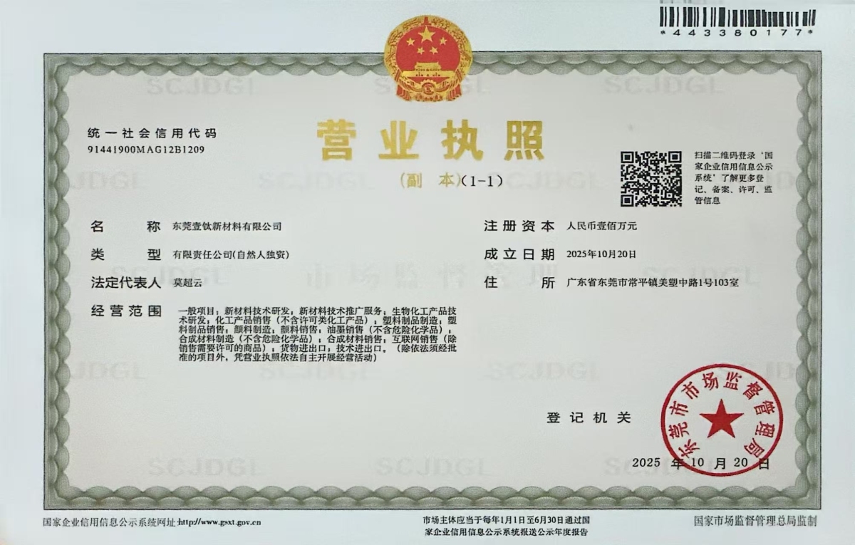• 东莞壹钛新材料有限公司是一家综合性:集新材料生产、销售、批发、代理、进出口为一体的一般纳税人企业,公司构建了完善的供应链体系,严格管控从原材料采购、生产加工再到成品配送的每一个环节,确保产品高效、准确地送达客户手中。