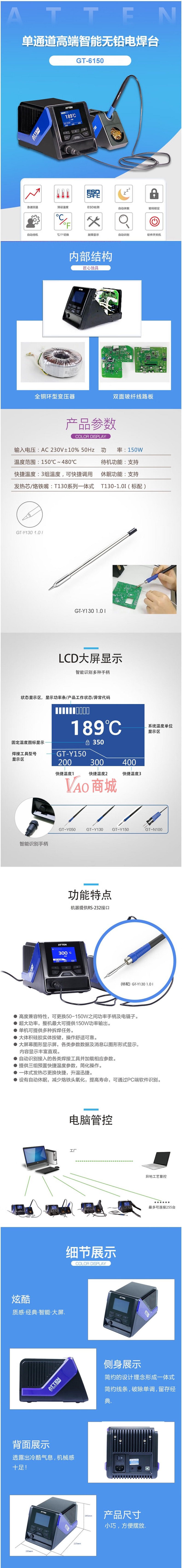 安泰信(ATTEN)单通道高端智能无铅电焊台GT-6150整机功率150W温度范围150-480度
