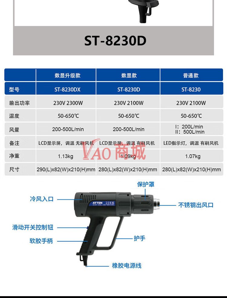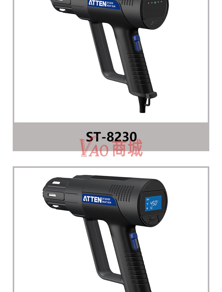 安泰信(ATTEN)大功率手持热风枪可调温数显贴膜除漆清胶热风枪ST-8230DX标配2300W(无刷LED显示)ROHS