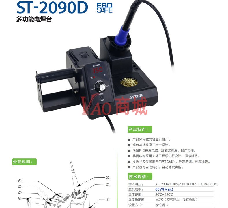 安泰信(ATTEN)ST系列多功能电焊台智能控温自动休眠电焊台ST-2090D维修焊台标配230V(80W)