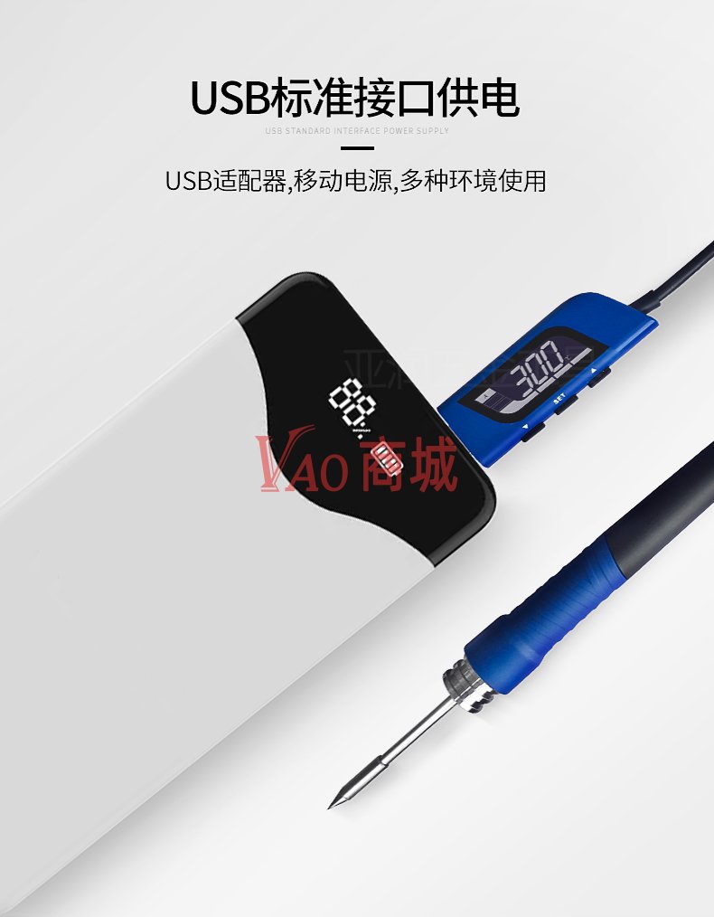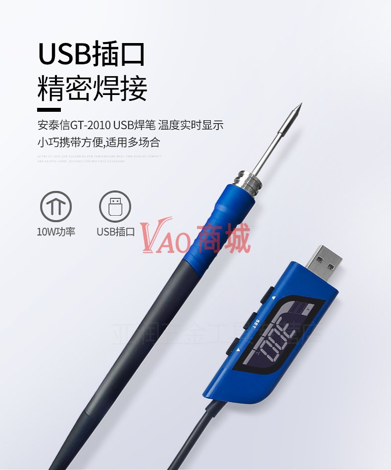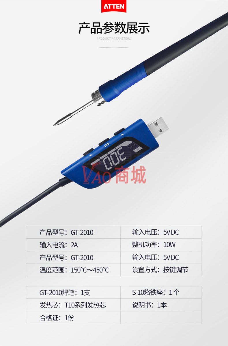 安泰信(ATTEN)USB充电式数显便携式电烙铁GT-2010电焊笔维修工具总功率10W温度150-450度发热芯T10系列一体式发热芯