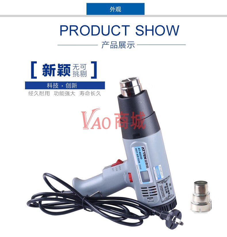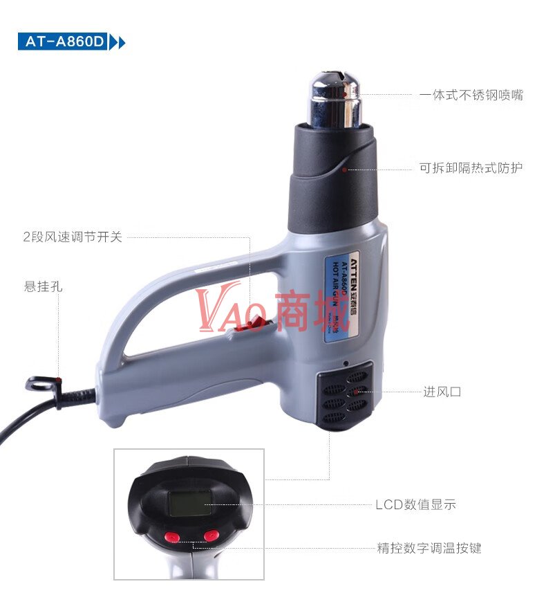 安泰信(ATTEN)AT系列热风枪数显热风枪可调节塑料焊接电烤枪AT-A822D-2000W热风枪2000W配风嘴