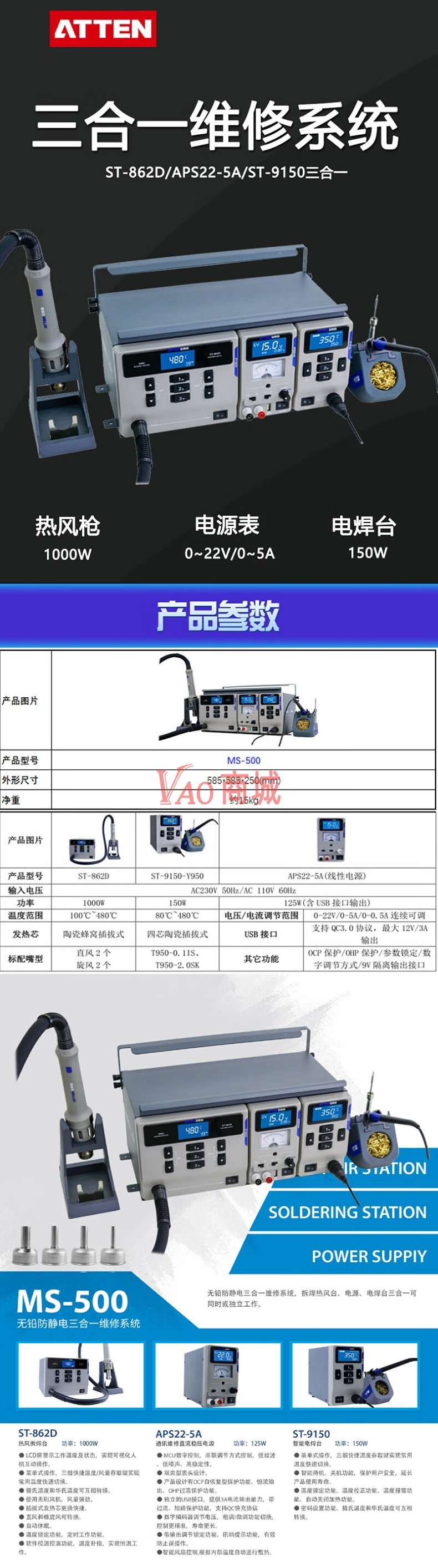 安泰信(ATTEN)三合一热风枪电烙铁大功率热风焊台套装MS-500230V数显稳压15V3A电源手机维修返修台自动休眠焊接维修拆焊台套装