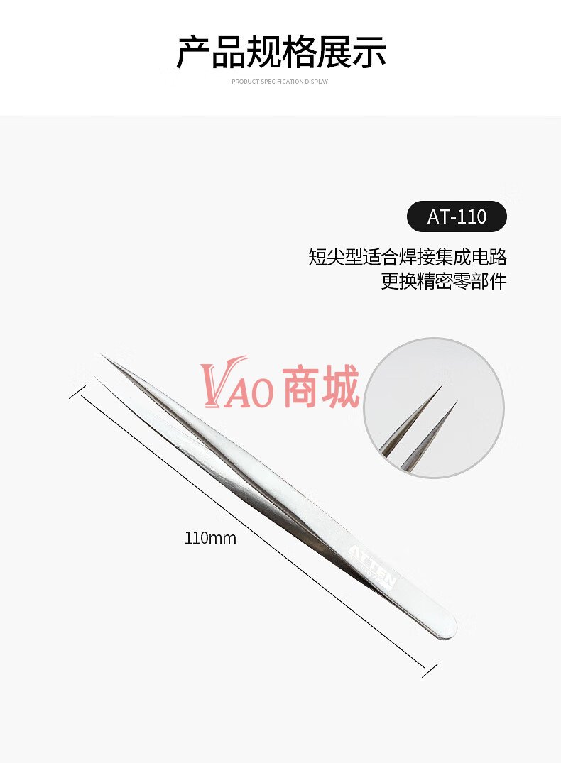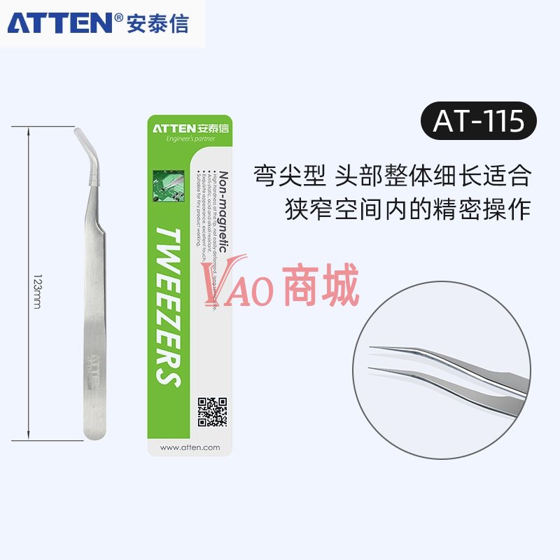 安泰信(ATTEN)不锈钢镊子AT-115维修工具配件弯尖型