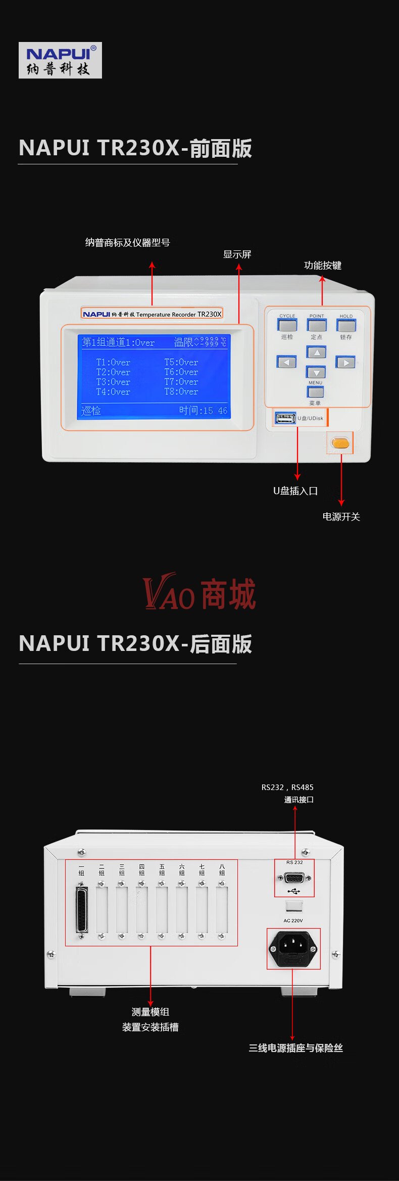 纳普(NAPUI)多路温度记录仪TR230X-40大屏带通讯温升热电偶测试仪40通道