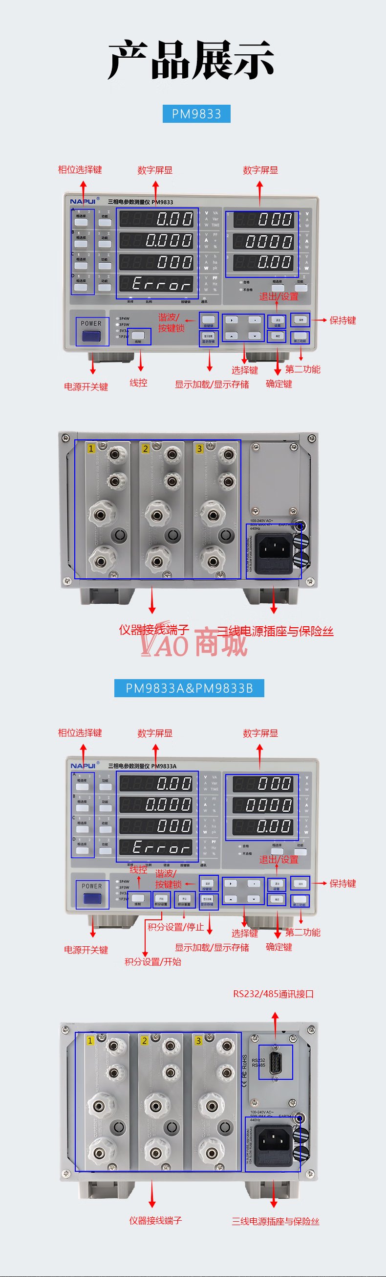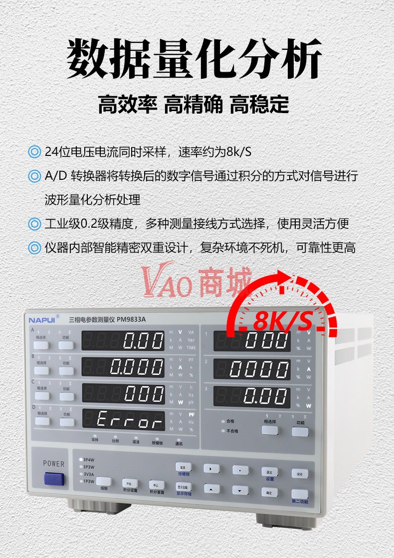 纳普(NAPUI)数字功率计PM9833A三相交流多功能型电参数谐波电能量电流功率测量仪精度:0.2%