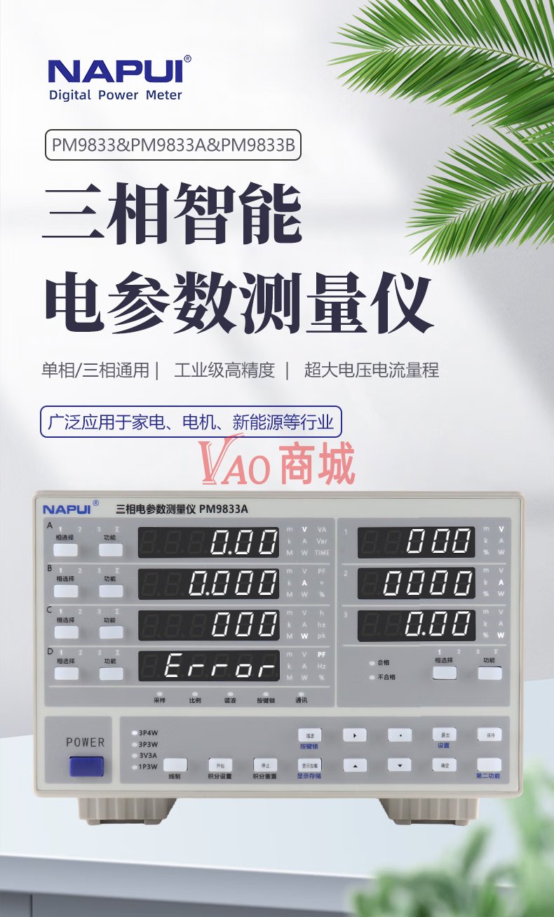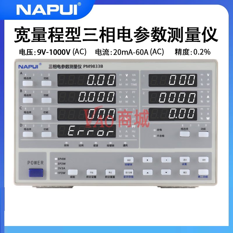 纳普(NAPUI)数字功率计PM9833B三相交流宽量程型电参数谐波电能量电流功率测量仪精度:0.2%