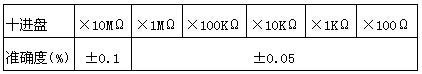 | 其它 | 准确度: ×10MΩ:±0.1%×1MΩ、 ×100KΩ、×10KΩ、×1KΩ、×100Ω、×10Ω:±0.05% |