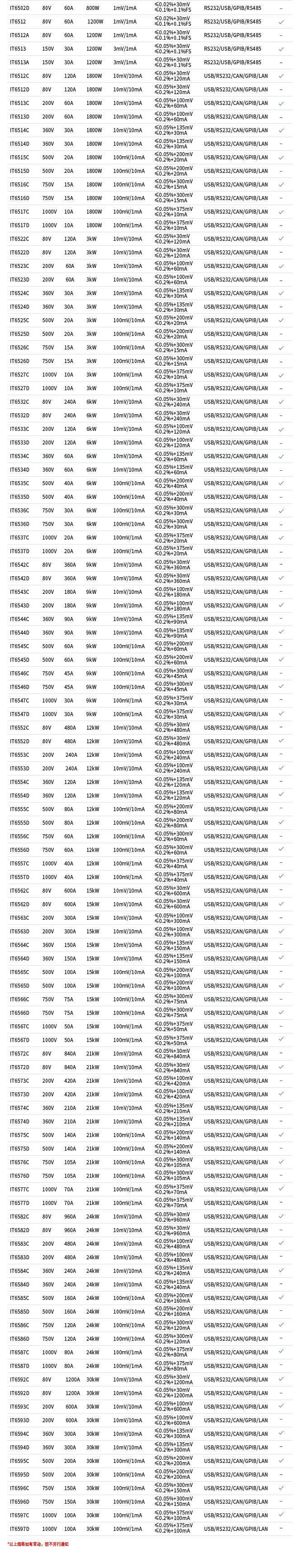 产品介绍 IT6500全系列超过100个机型。功率包含从800W到30KW,以及高达1000V/1200A的输出范围。支持主从并联,主动均流,并在功率扩展后保持单机优异的动态特性。不但有丰富测量功能、高速响应的IT6500C系列,同时也提供高性能、稳定输出的IT6500D系列,用户可以根据需求,轻松选择。应用领域包括汽车、绿色能源、高速测试、大功率测试等多个方面,是一款功能全面、性能优异、适用广泛的直流电源。尤其是